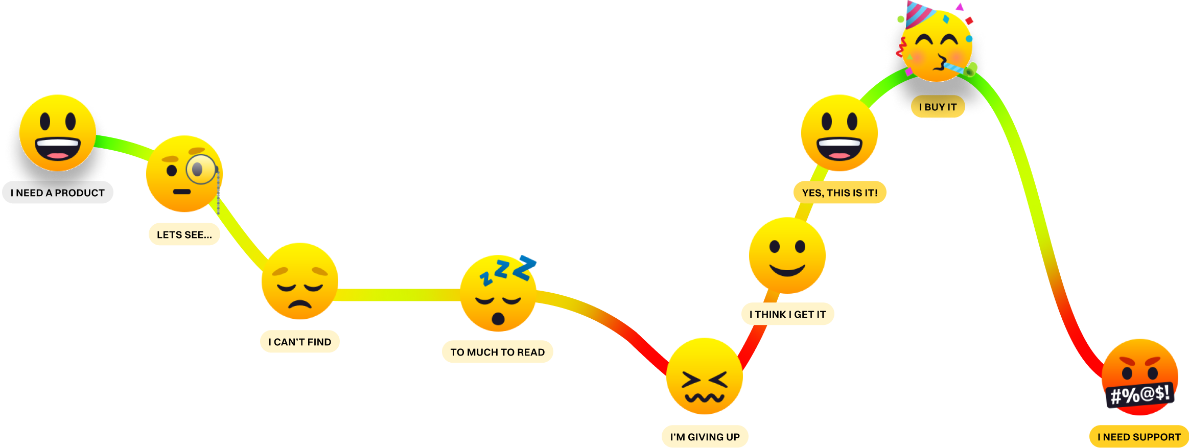 From the interviews, a map of people's emotions is made when interacting with the product and what emotions they experience when meeting a particular need. This map allows us to identify the high and low points of the experience.