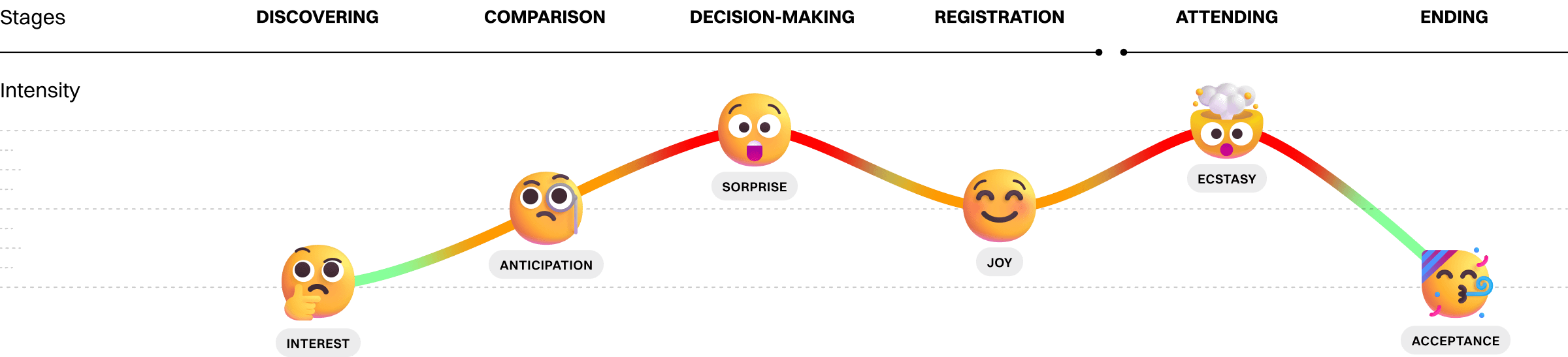 From the interviews, a map of people's emotions is made when interacting with the product and what emotions they experience when meeting a particular need. This map allows us to identify the high and low points of the experience.